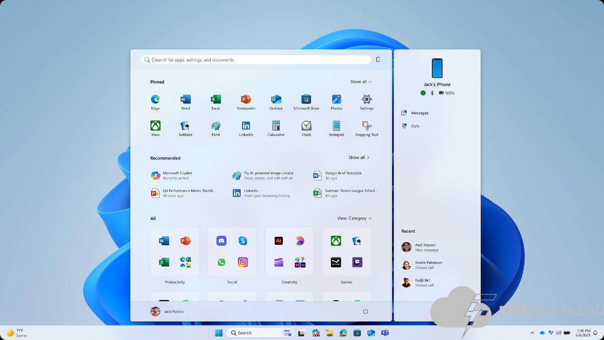 The grid view is an alphabet view that displays apps as a scrolling list. Clicking on the all button will take you to the complete list of apps, and it works in both ideas. Microsoft says that Start will remember your favorite view. The start menu has a new mobile device button next to the search, which brings the phone link panel.